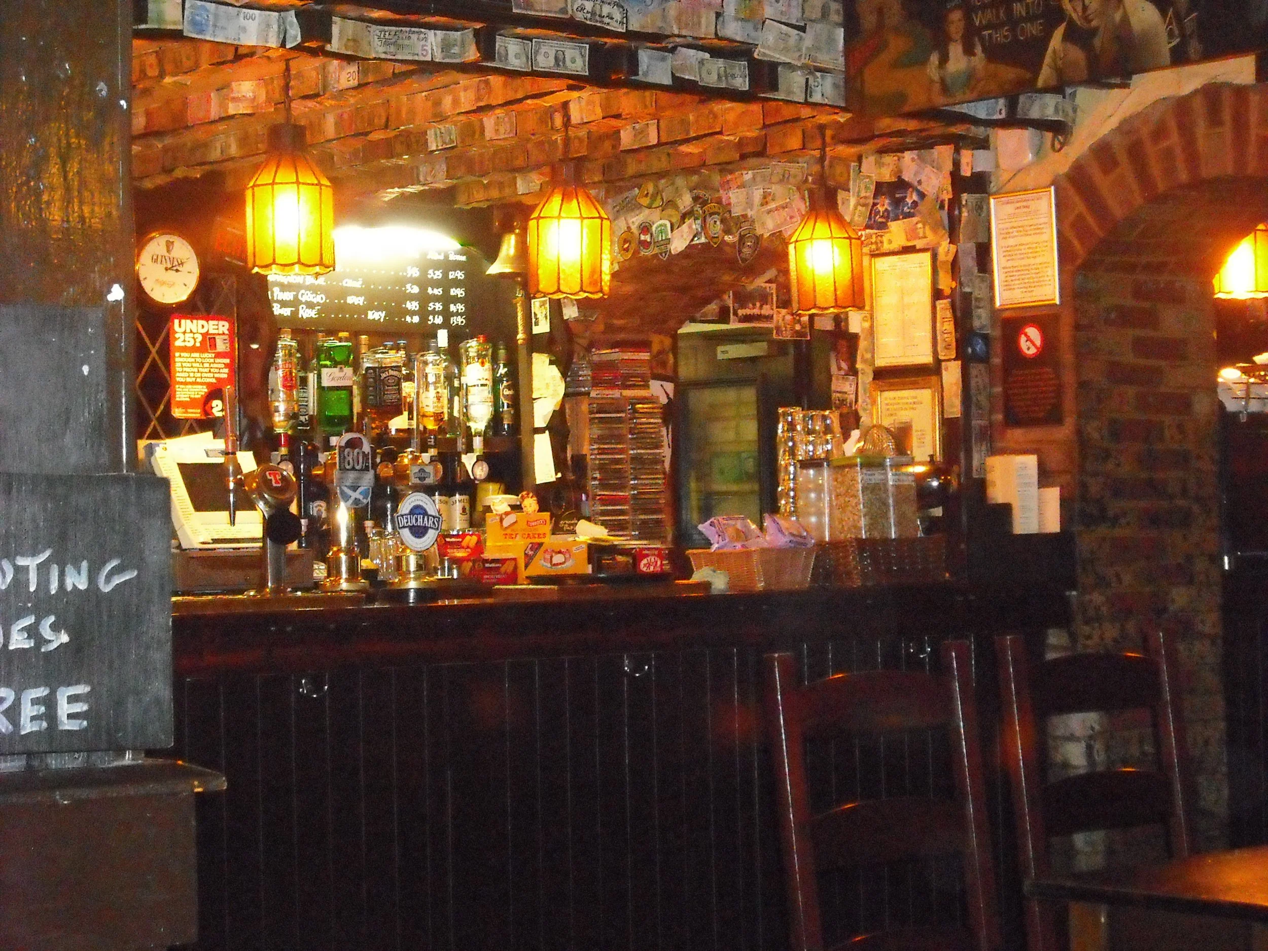 Biddy Mulligans has the distressed look expected from Irish named pubs. Larger than it looks from outside, a round serving bar awaits inside the entrance. Around the other side it opens up to reveal a larger seated are and beyond that another swerving counter. Food, outside seating and music. Also aimed a sports TV fans.