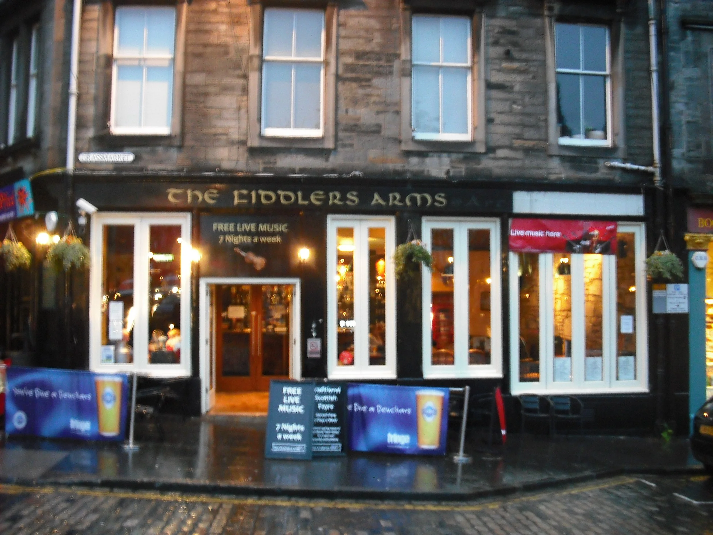 The Fiddler's Arms is a small bar with an old traditional look inside but with large windows for viewing the Grassmarket. Music most nights and food all day. Some seating outside by the road.