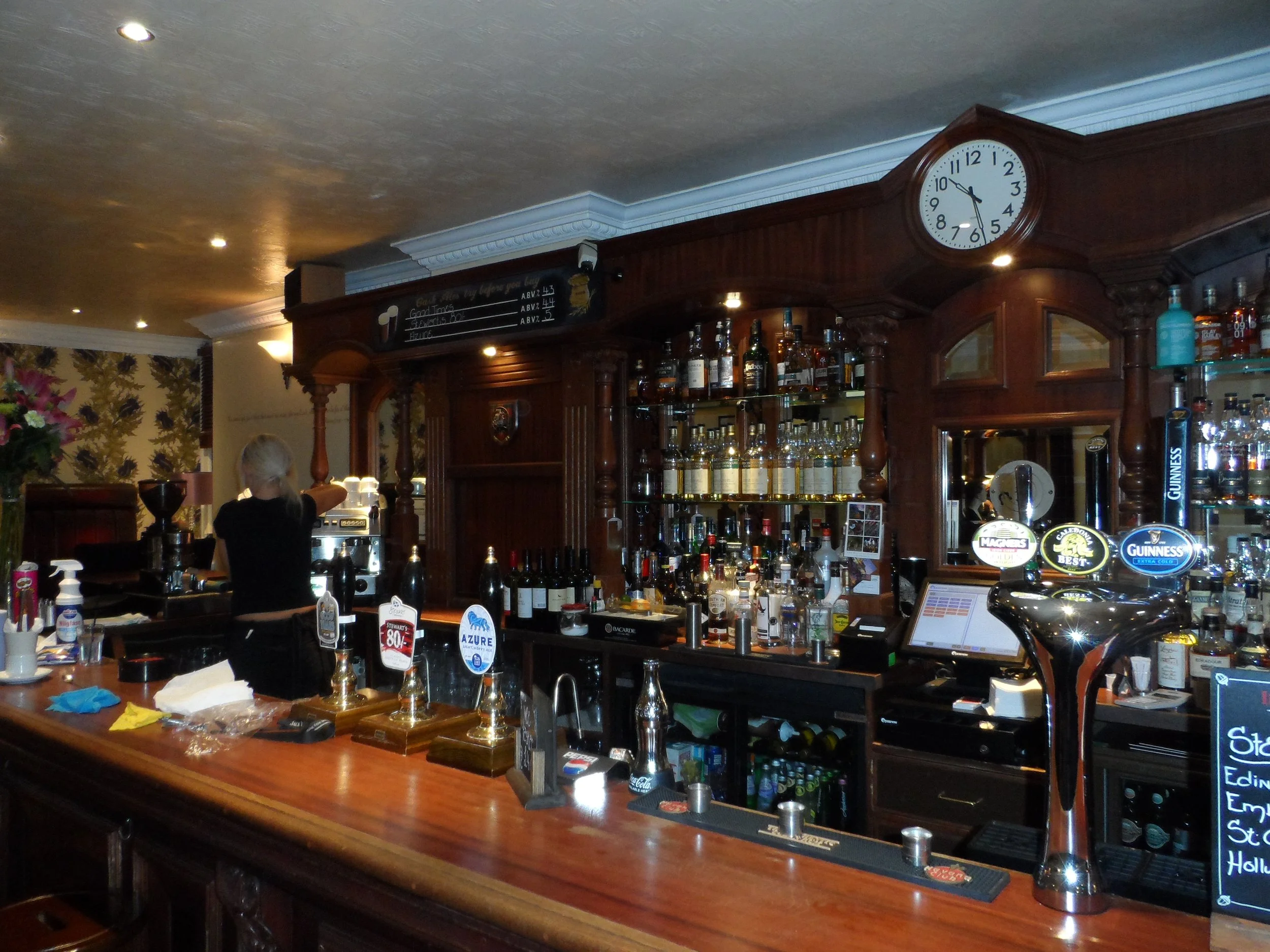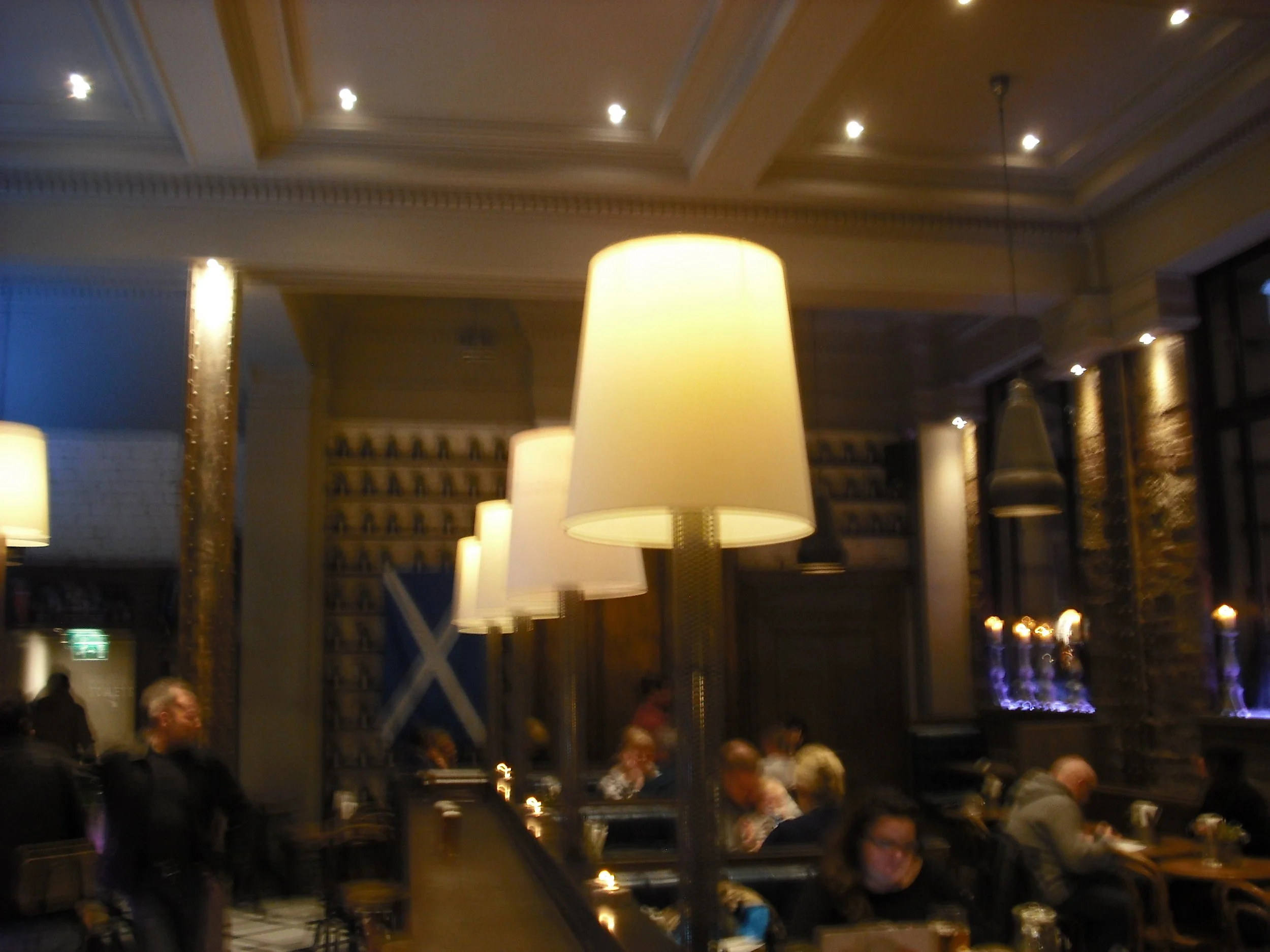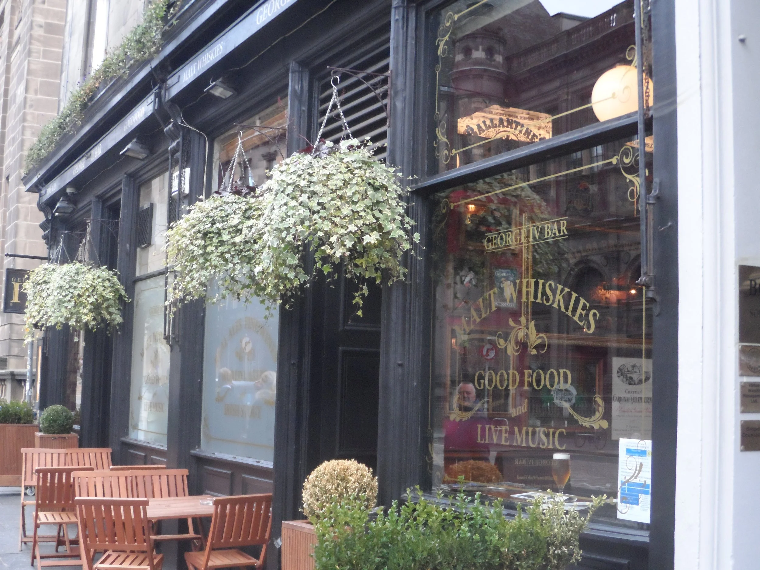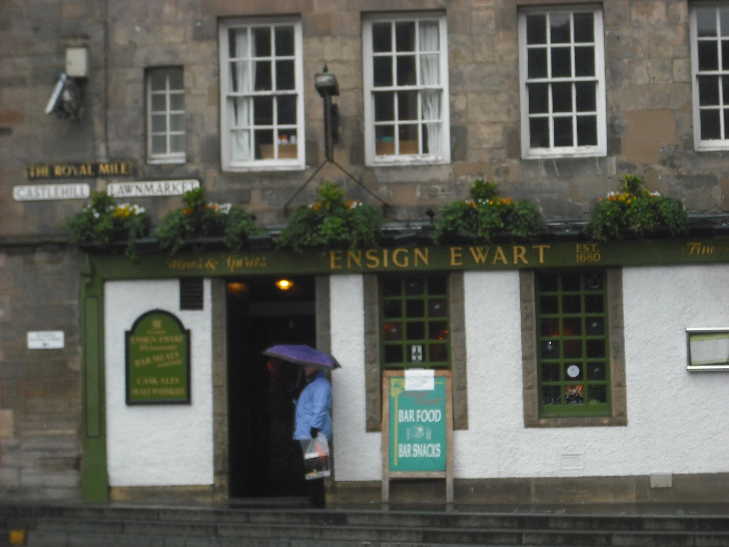 Ensign Ewart is a small two roomed pub at the top of the Royal Mile. Low beamed roof and quite dark it has traditional wooden chairs and tables with settles round side. Decoration reflects battle of Waterloo time. Practically empty pub for one so close to the Castle. Code for toilet! Does food