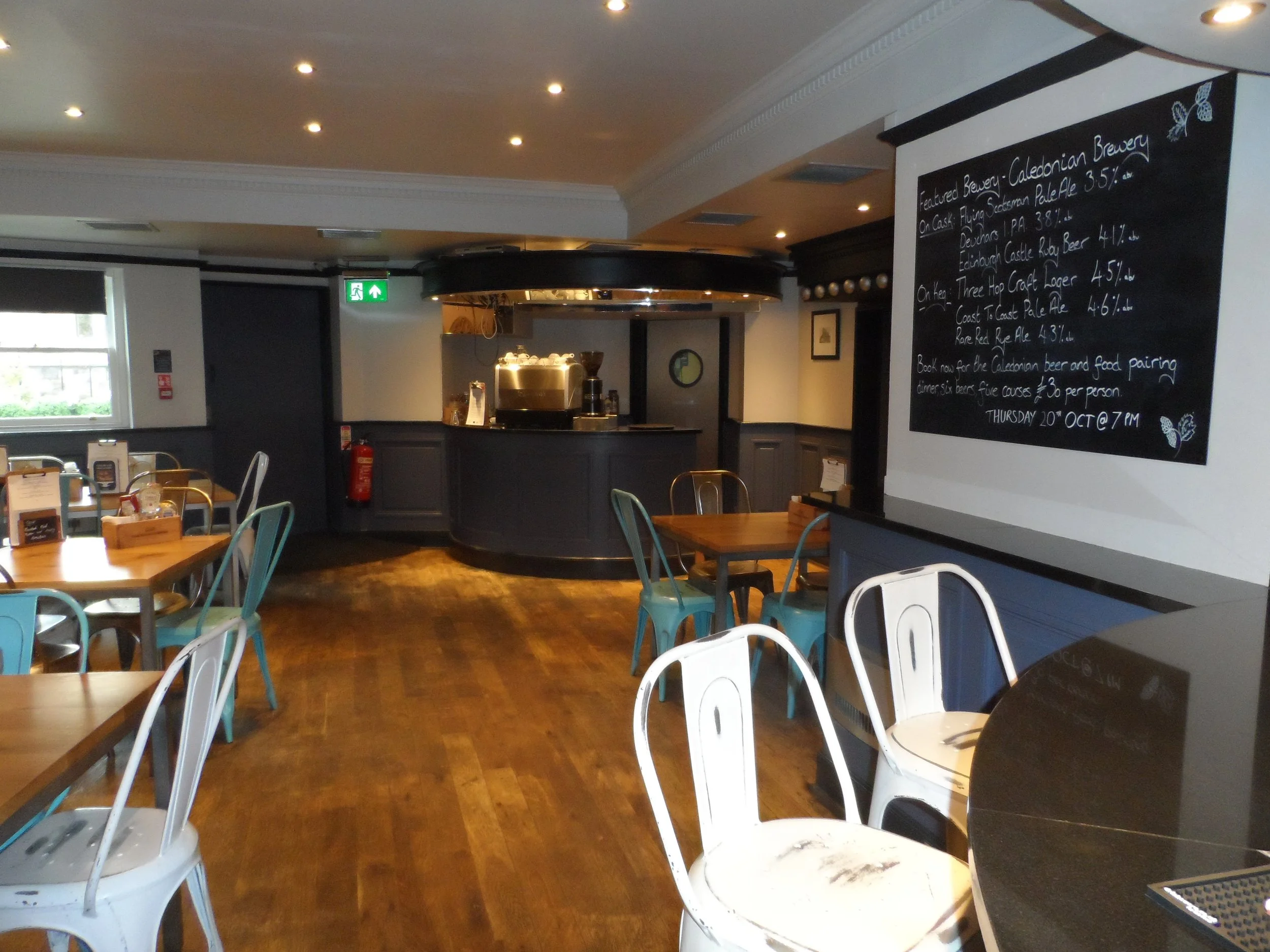 Canons’ Gait is a bright modern bar/diner. The floor, walls and tables are all light coloured. The chairs are distressed metal. The Servery is stainless steel. All of these reflect the bright lighting scheme. However, it all works well together. 4 pumps and numerous Scottish craft beers in bottle
