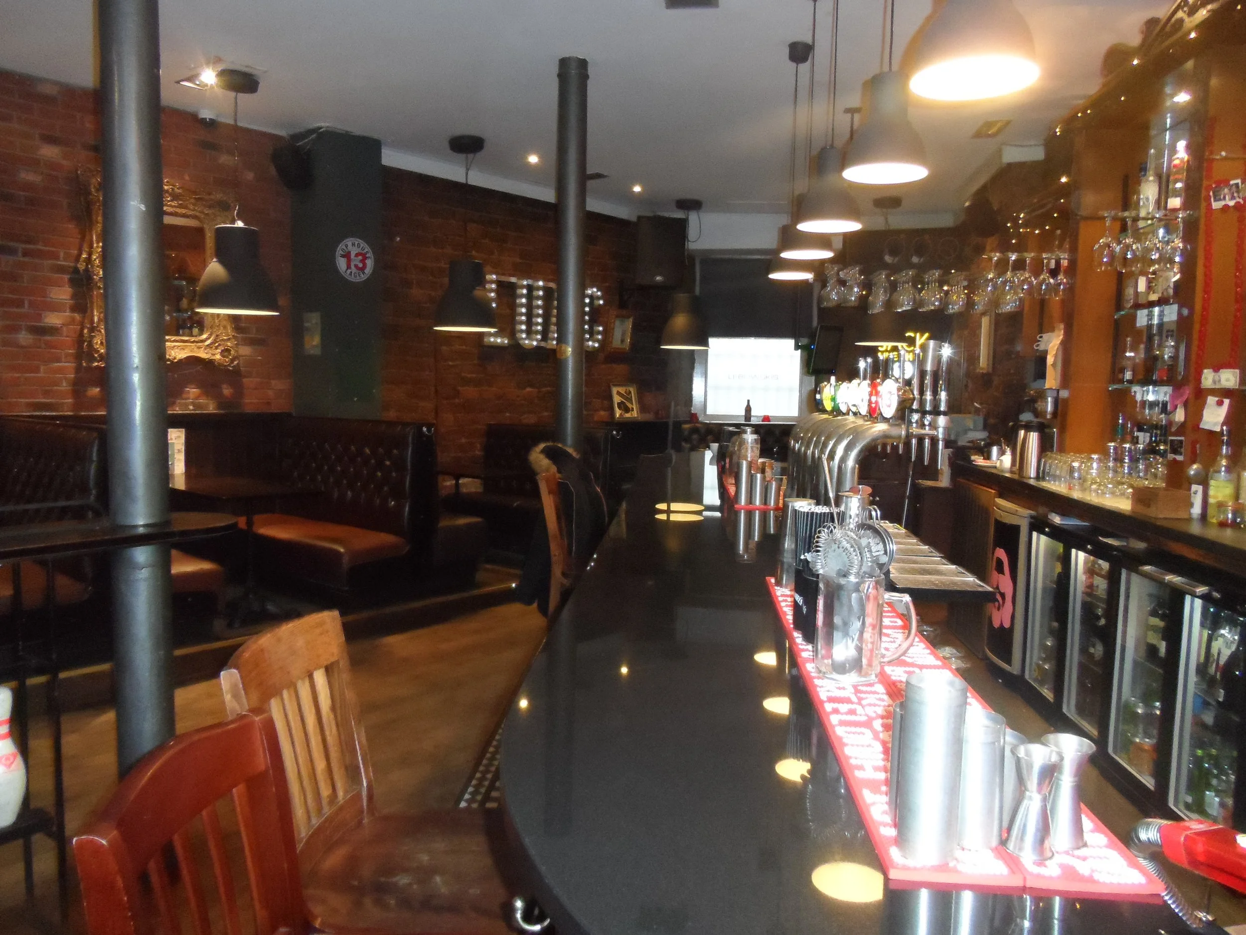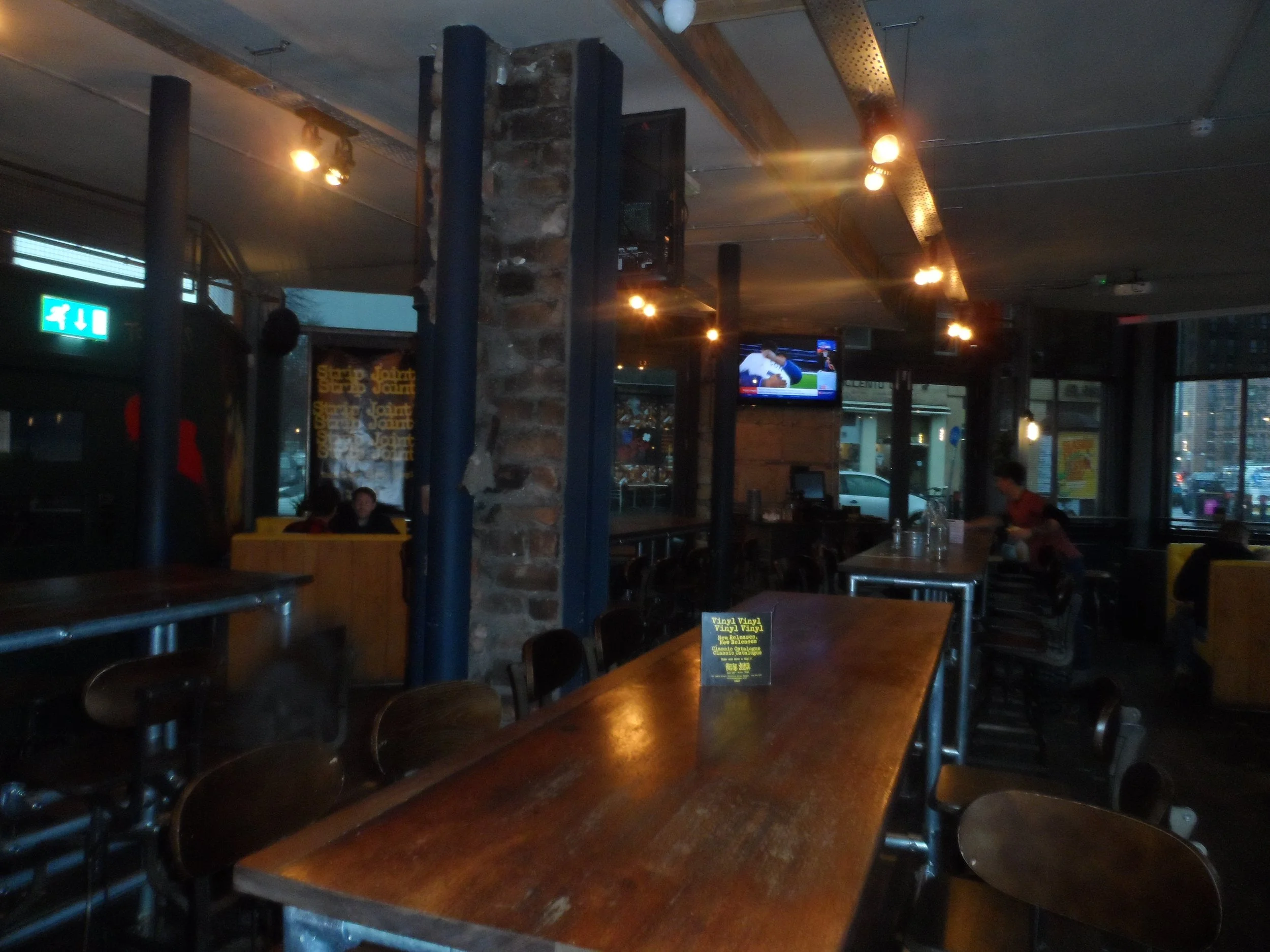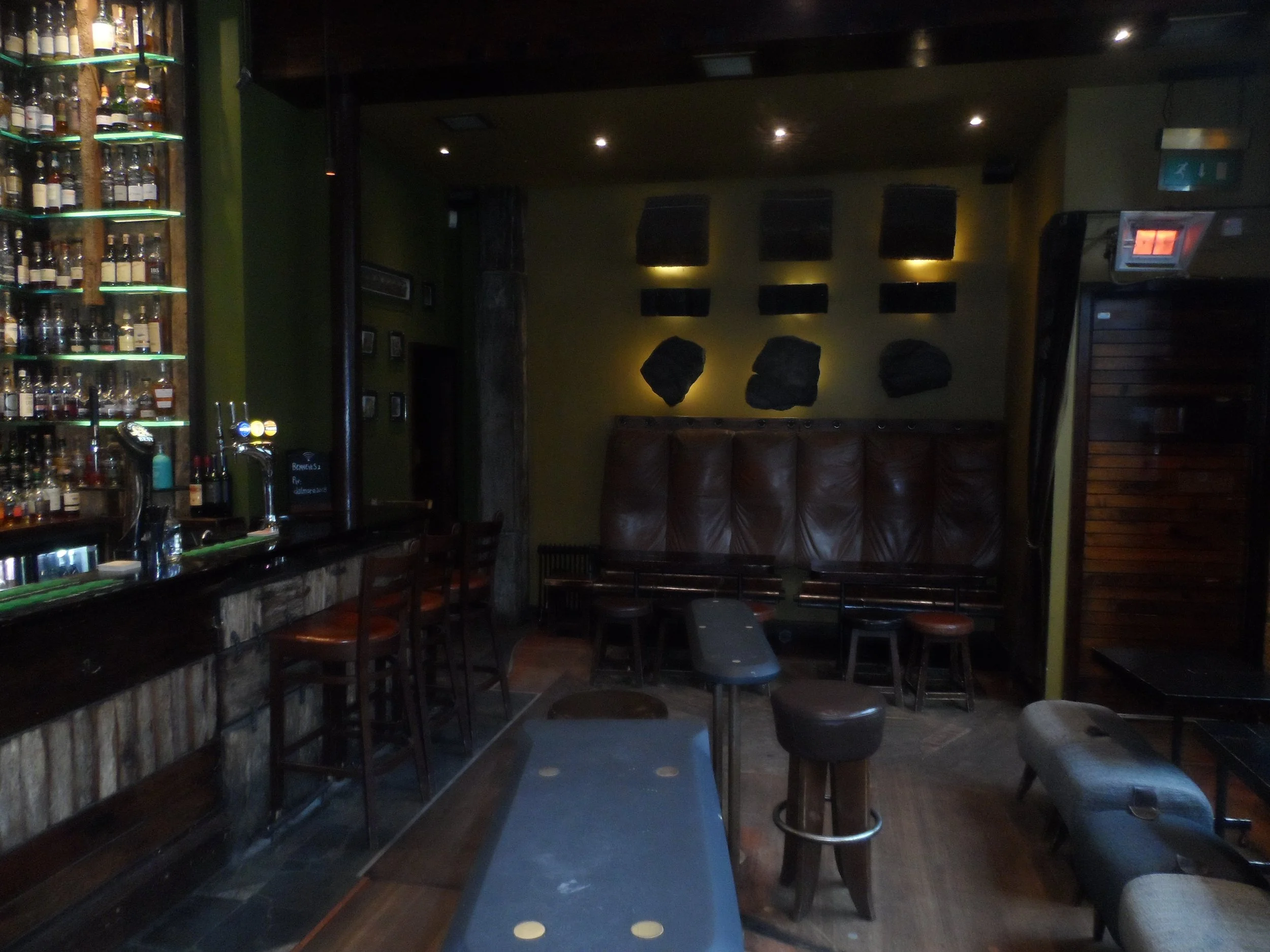 Lebowskis (West) - The room has a triangular shape. Door on corner has booths going down left wall and seating along to the right by the window. The servery is the far side of the triangle. Quite a bit a standing room in the middle around thin shelf counter. Wooden floor tiled around servery. At right of servery the window side of room continues past the servery into some more seating beyond