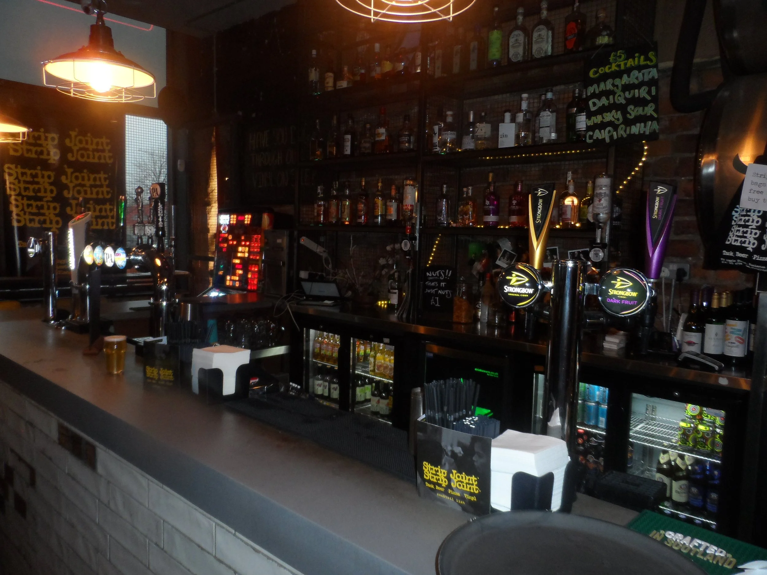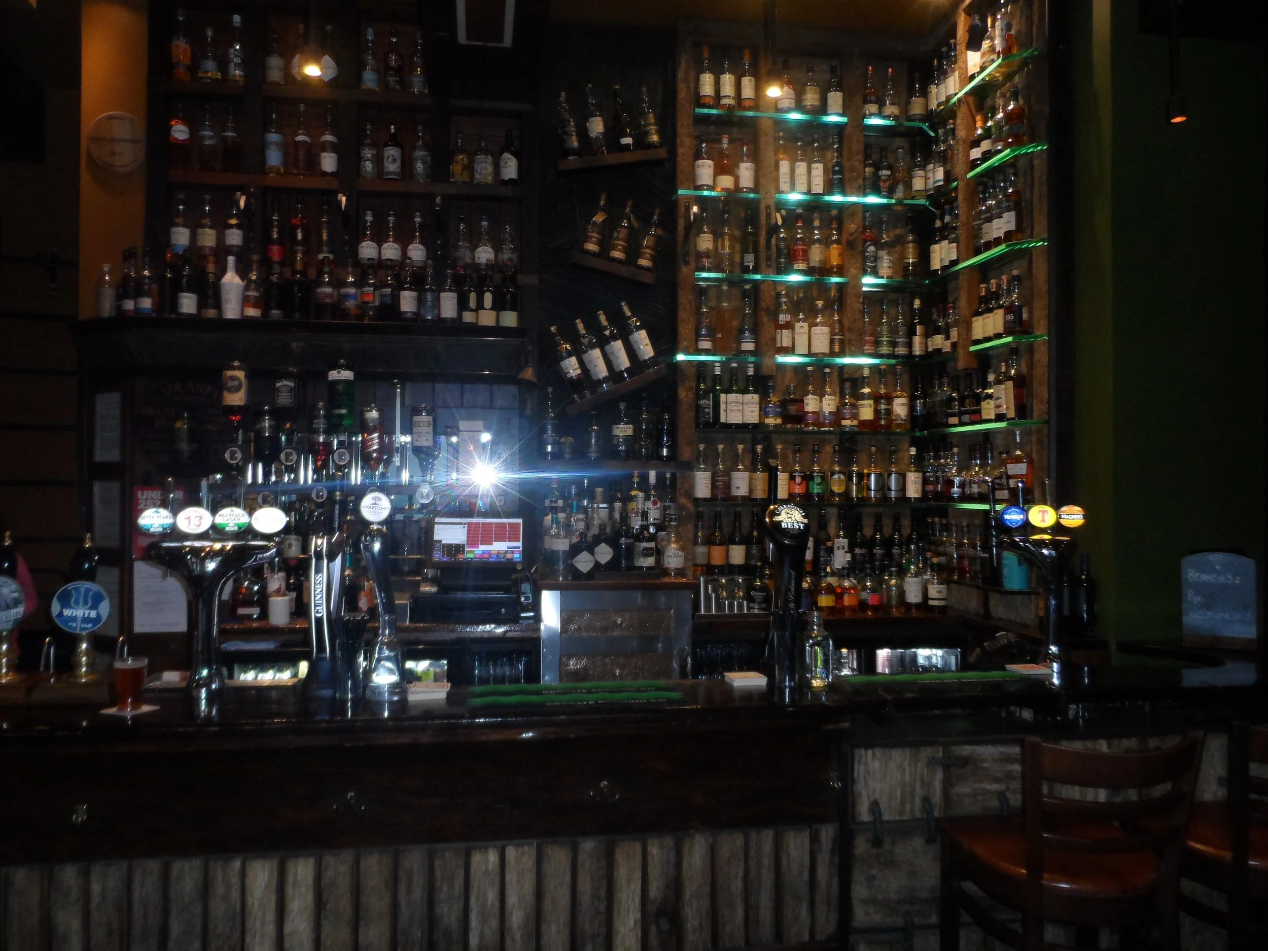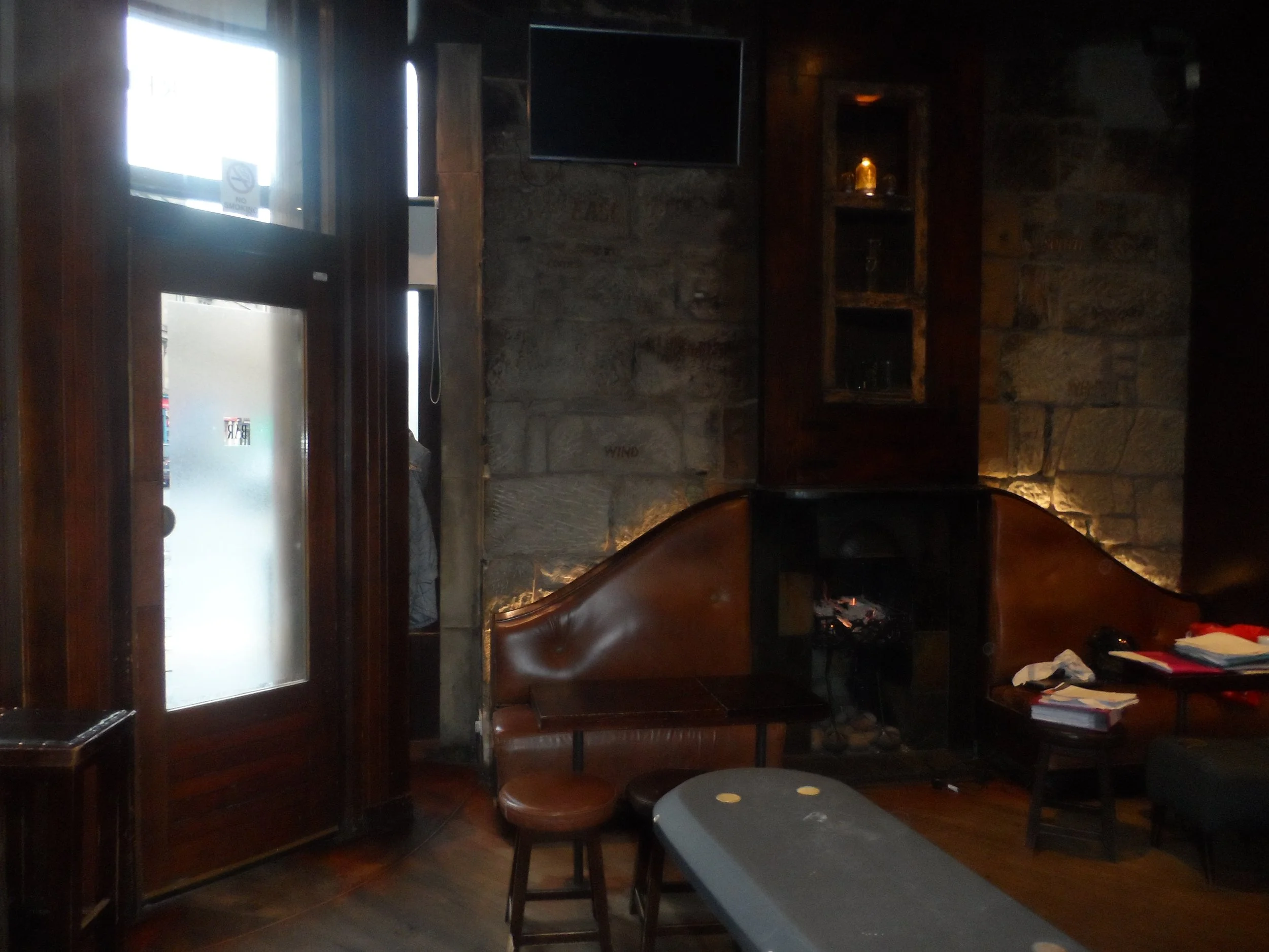 Lebowskis (West) - The room has a triangular shape. Door on corner has booths going down left wall and seating along to the right by the window. The servery is the far side of the triangle. Quite a bit a standing room in the middle around thin shelf counter. Wooden floor tiled around servery. At right of servery the window side of room continues past the servery into some more seating beyond
