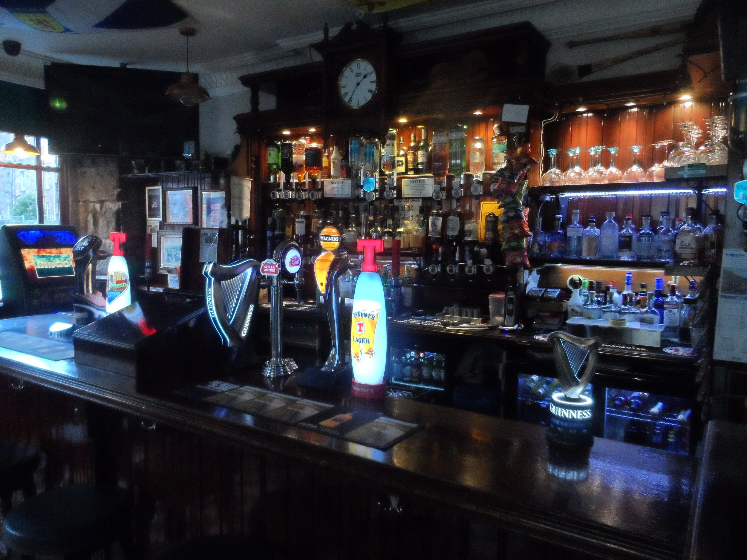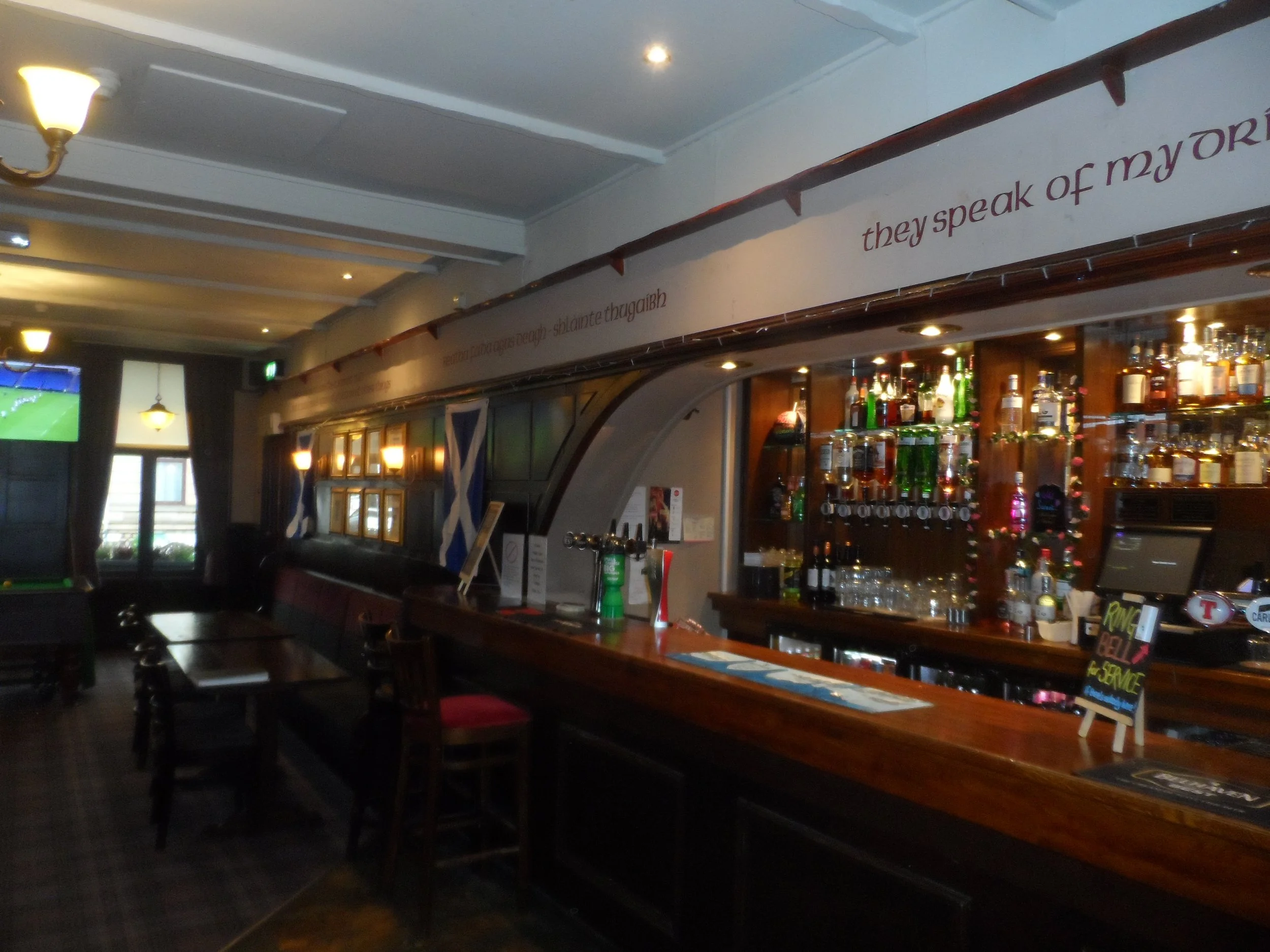 The Snaffle Bit (Belhaven) Another corner pub and one of the few to have separate bar and lounge. The main door at the front takes you to lounge to right and bar to left. The two rooms are connected at the rear. Around the corner is a side door to lounge. There is outside seating either side of main door. The bar has a long servery on middle wall and same servery, though half the length, serves the lounge. The bar has banquette seating around three large semi-circular booths and wooden flooring. In the lounge there is a pool table by the front windows. Banquette seating and long tables down left side leading to servery at end while other side has small booths. There is a tiled floor by the counter and carpet at the seating.