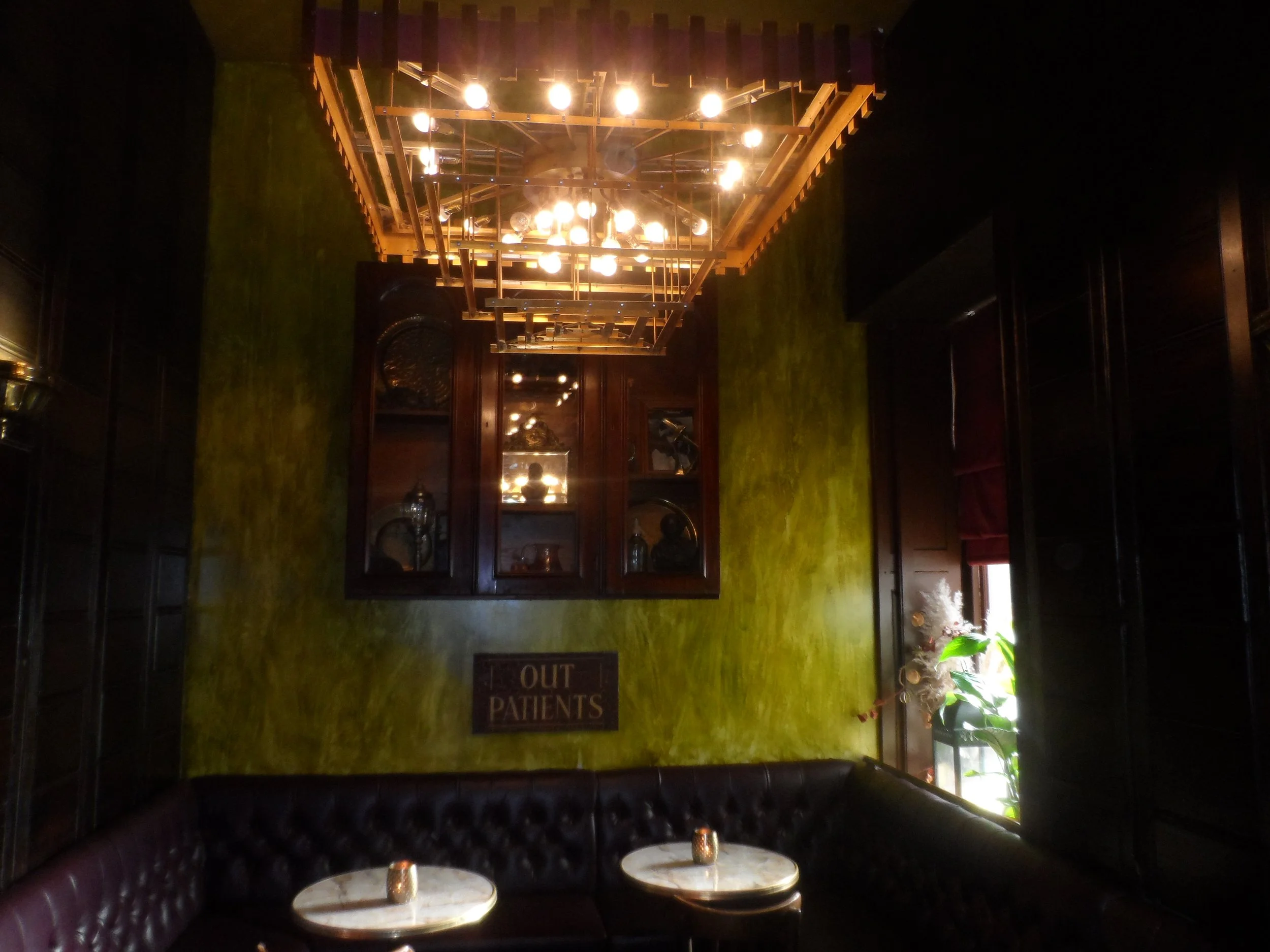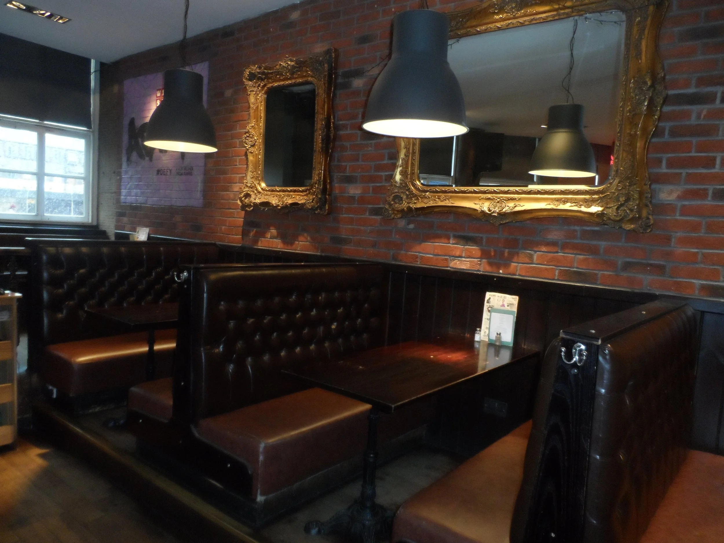 Dirty Duchess is a small one roomed bar. The servery is on the left side short wall. Dark brown wood on walls, wooden floor, dark red upholstery and low lighting make the room dark, even with lots of mirrors, and atmospheric. There is some well upholstered booth seating and several tall tables and (out of place) uncomfortable metal stools.