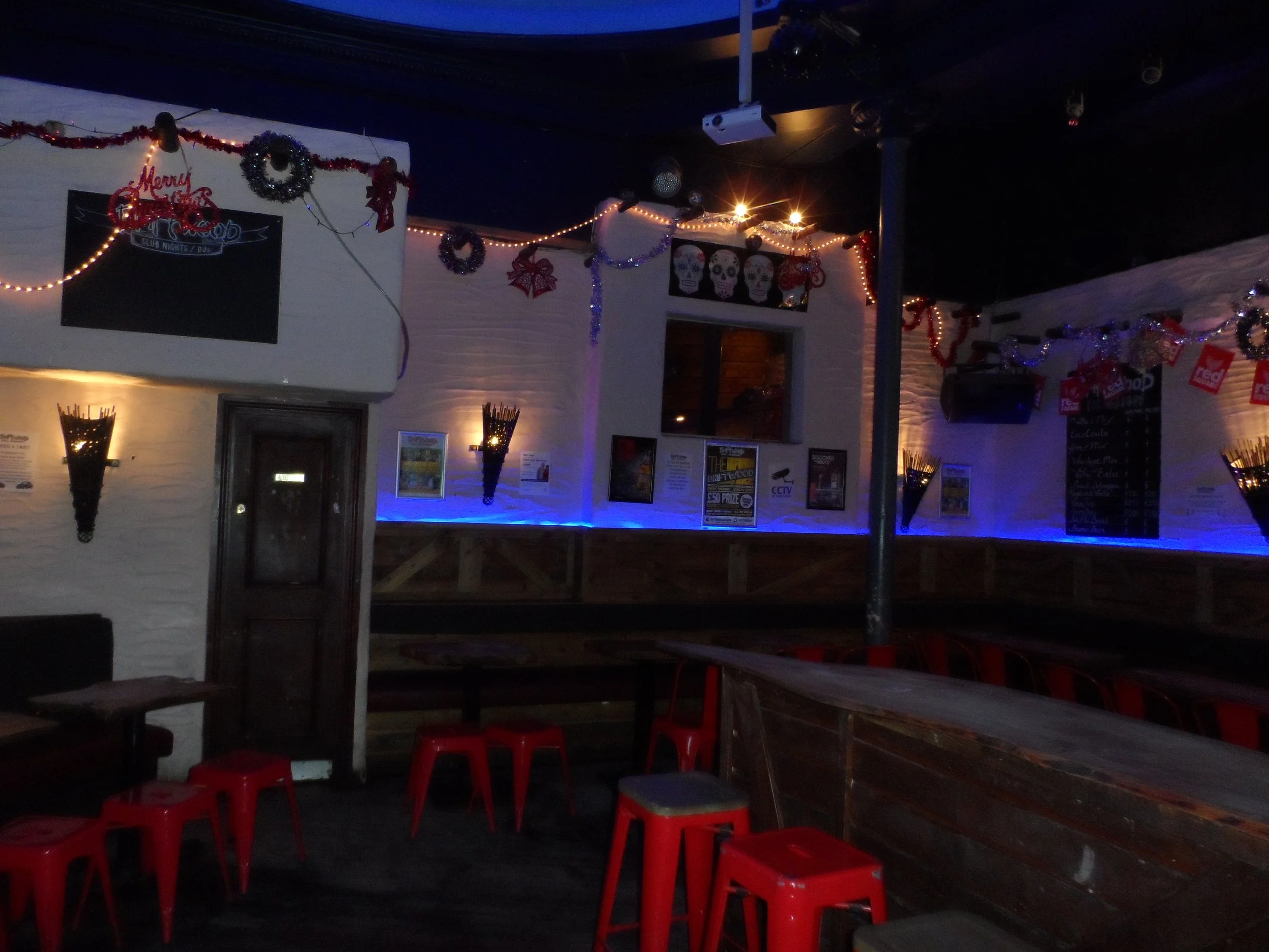 Driftwood Bar is a student party night and quiz venue. Tall servery with stools on left side immediately inside the door. To the right are some stools and booths.