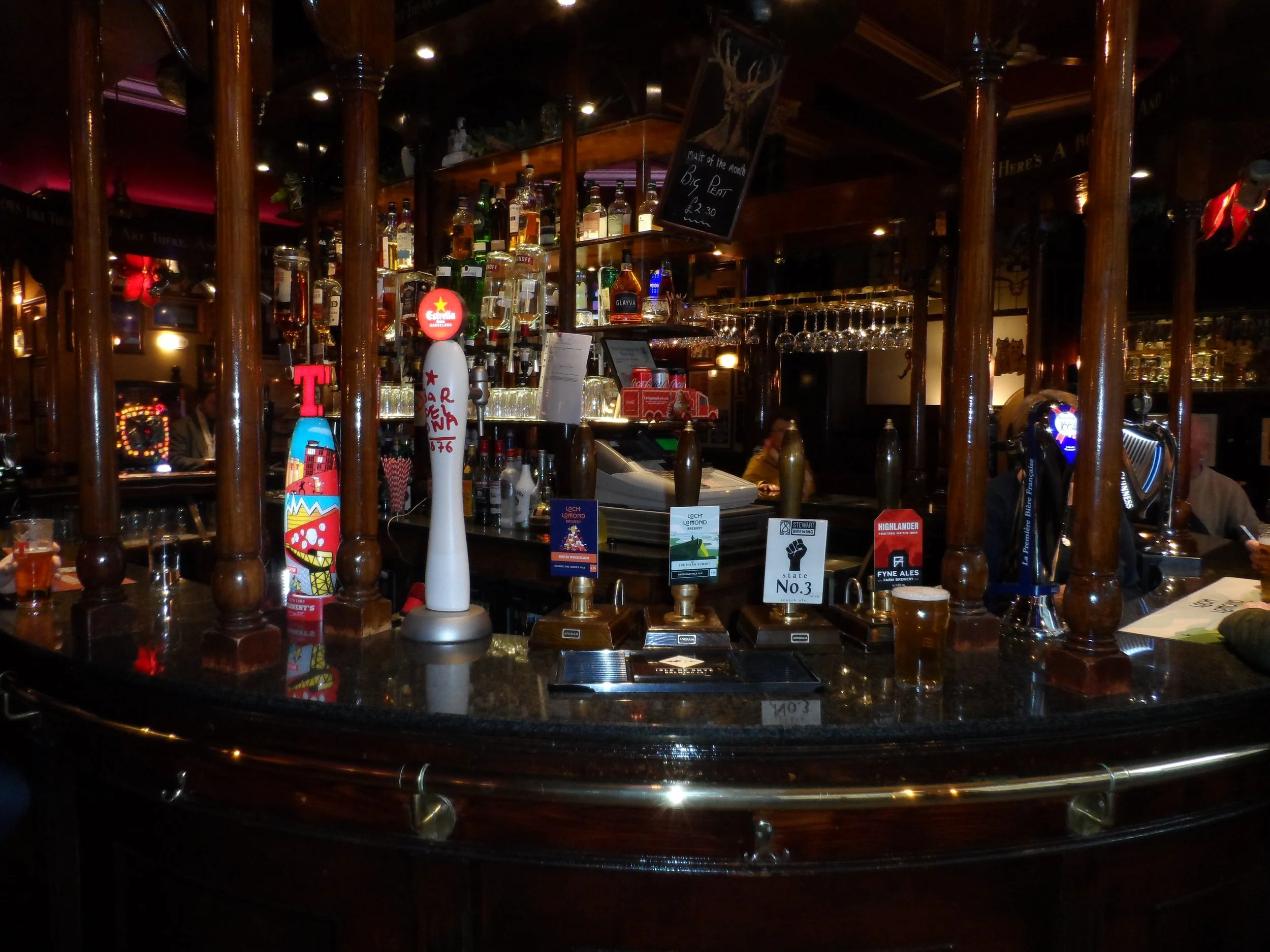 Real ale: usually 10 pumps - nice to see real ale handpumps outnumbering keg taps Stout Jock; Balmy days (Adnams); Ritual Pale (Alchemy); Glasgow Cross (Broughton); Thekstons Bitter; Inferno (oakham); Edinburgh gold (Stewarts) Born Brewery IPA