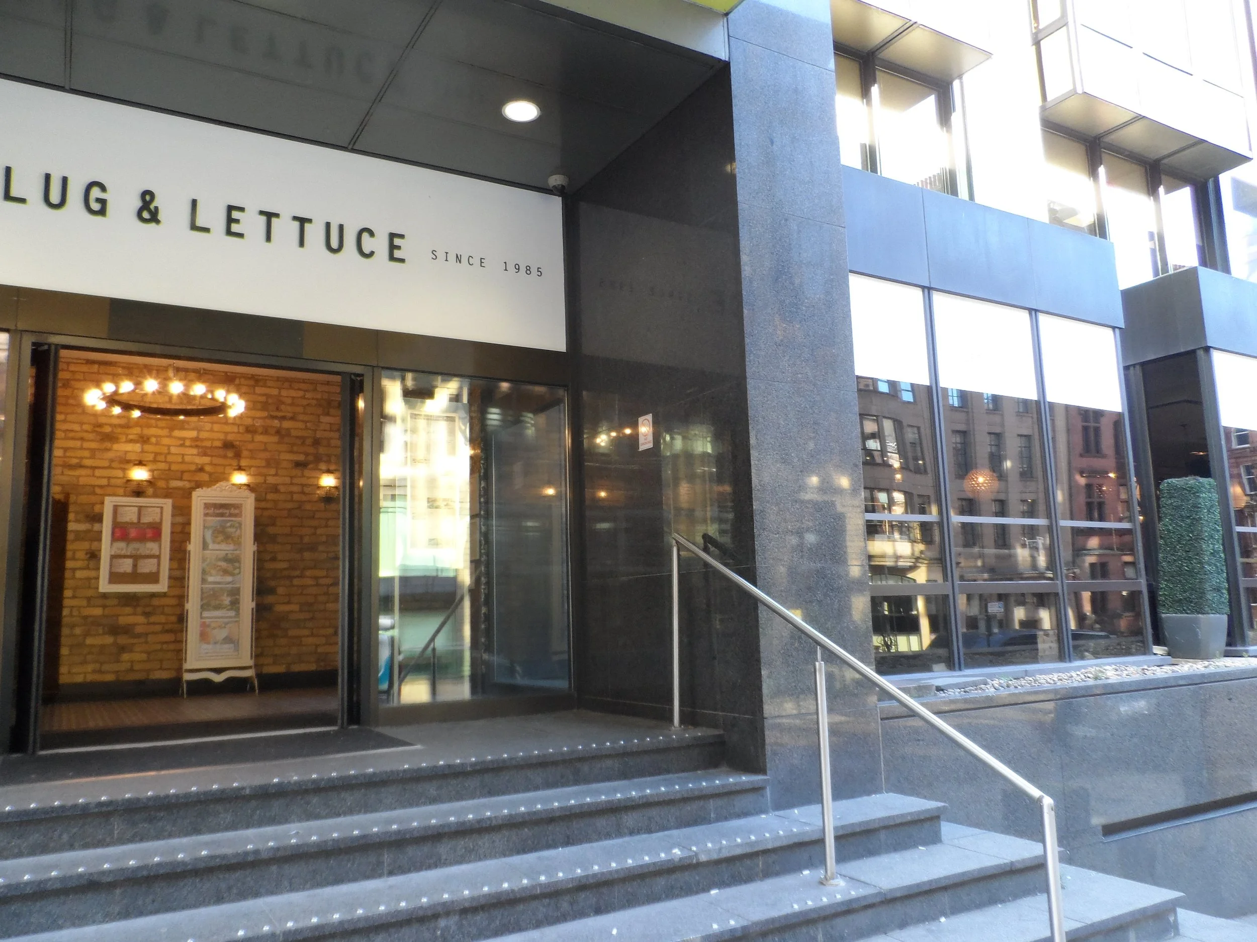 Slug and Lettuce has a long thin bar room into the right with more seating going to the left behind the long . The room opens out at the far end of the servery. Opposite the servery are some booths and some seating along side the large windows. there is lots of lighting to aguement the daylight coming in the large windows.