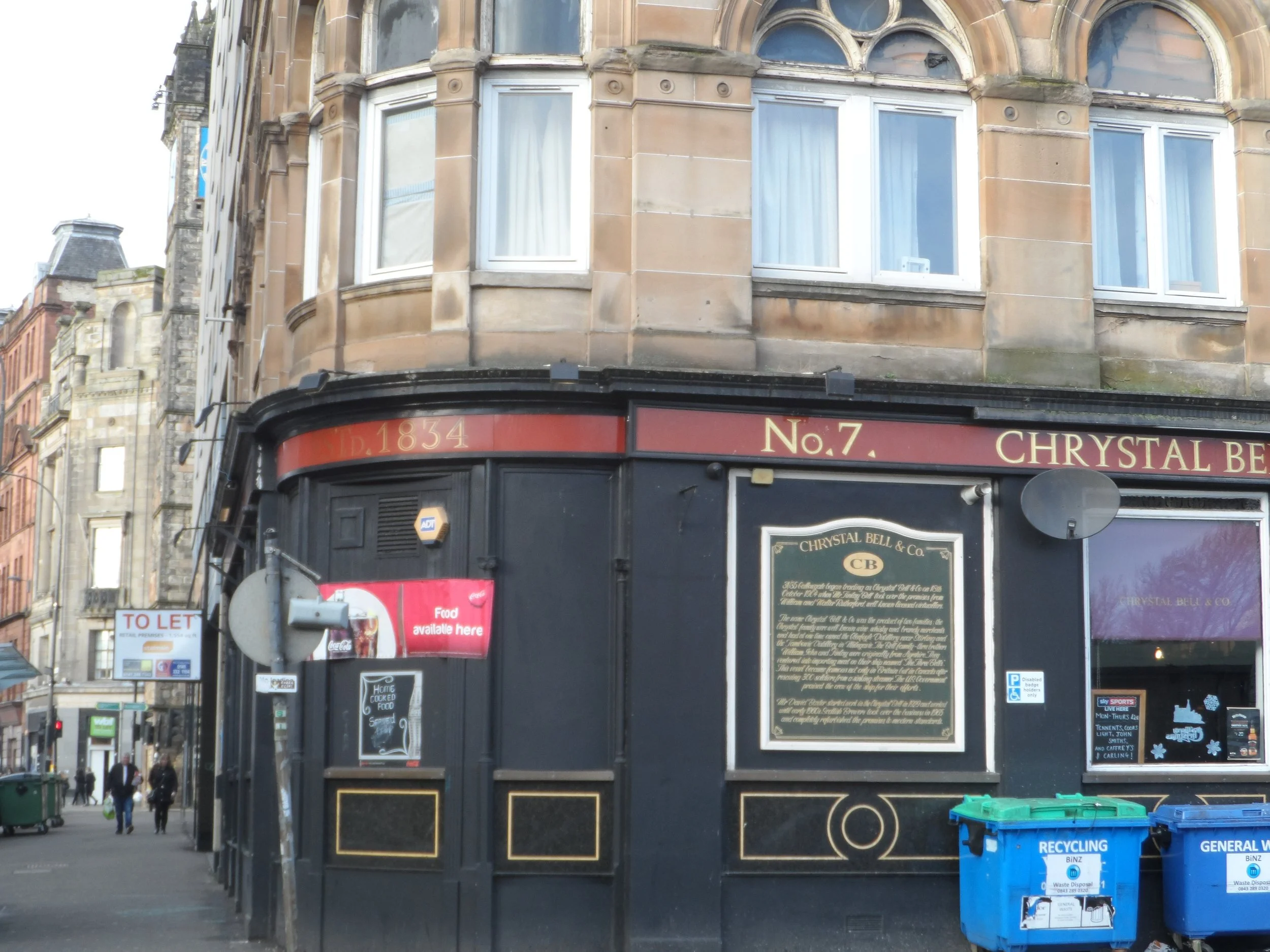 The Chrystal Bell & Co is a one roomed corner pub with entrances from both sides. From the 31 Gallow gate entrance the bar comes out from the far wall in a small horseshoe shape. There are booths down the left-hand wall and in the far-right hand corner is seating and the other entrance. Along the windows overlooking the Gallowgate is a raised seating area, up a couple of steps, with padded banquette seating and tables. This makes a lounge area apart from the main bar area in front of the servery counter. All floors are wooden and there is a high ceiling with cornicing. There are TVs on the wall and stools at counter. An “old man’s pub”, with prices reflecting that, that has been restyled with new furnishing but still has the old flavour. HISTORY - see OLD GLASGOW PUBS