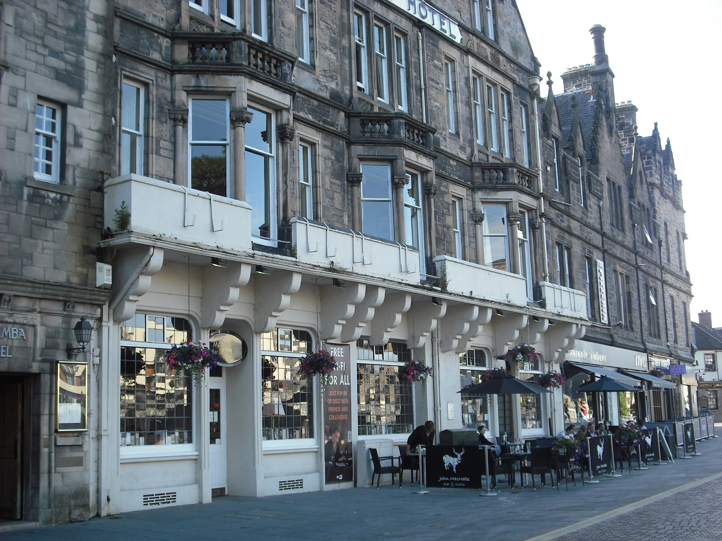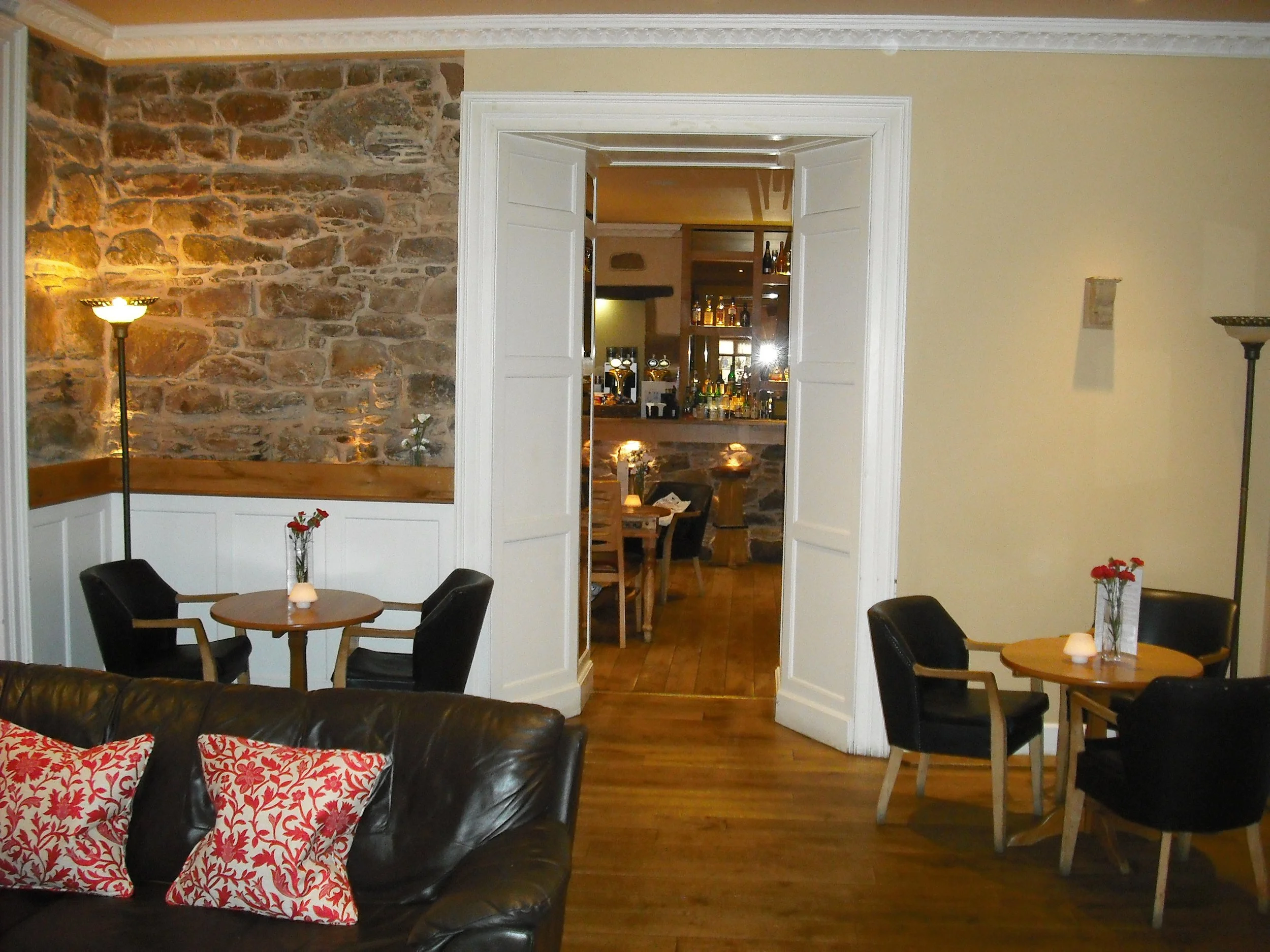 Columba Hotel has a large lounge called McNabs. this is a large airy bistro with lots of space. Tables to right of bar an opposite bar geared for eating. Some relaxing armchairs to left of bar. Plenty of space outside looking across the river.