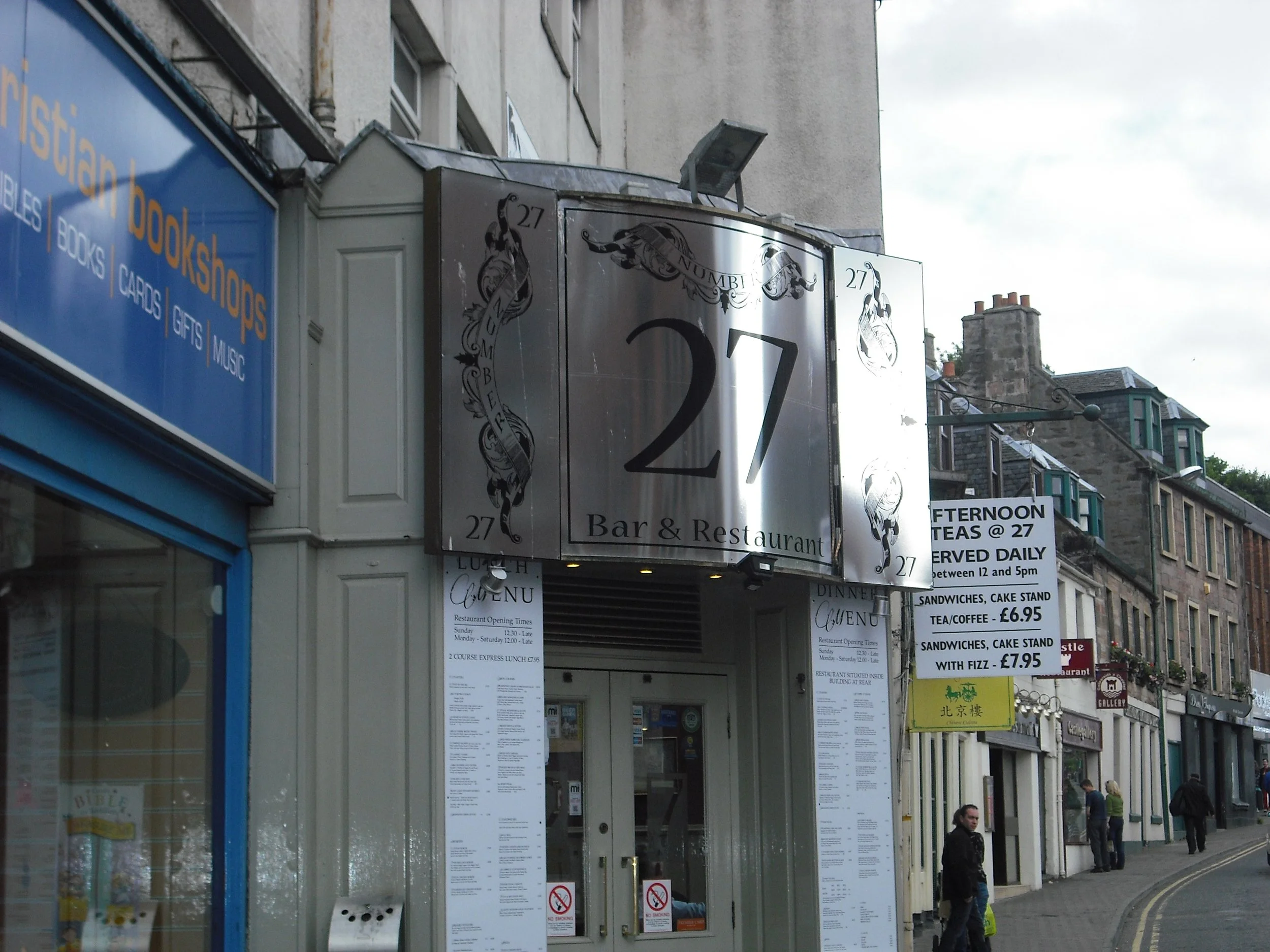Number 27 is a lovely cafe bar. Tables for sitting at the front, then the bar with seats for two opposite, followed by a wider area housing the restaurant. Wood panelling half way up wall, painted a light green gives a nice feel to the bar. 4 Real ales + 10 bottled ales on Saturday