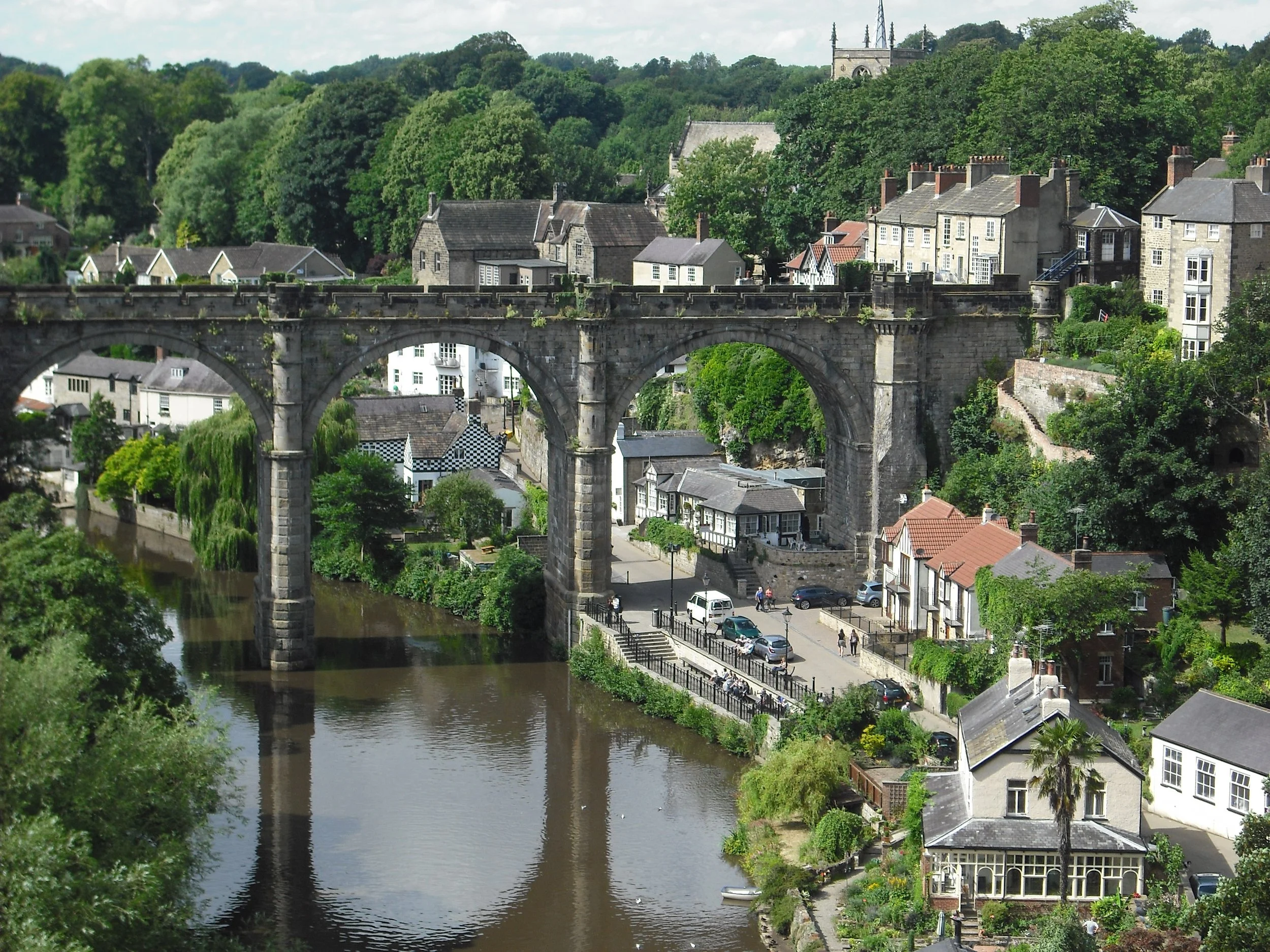 Knaresborough is a small market down (pop.14,000) found by road and rail between Harrogate and York. The town is mainly situated above the banks of the River Nidd with steep roads, lanes and stairs leading down to the waterside where boats can be hired and many cafes visited.