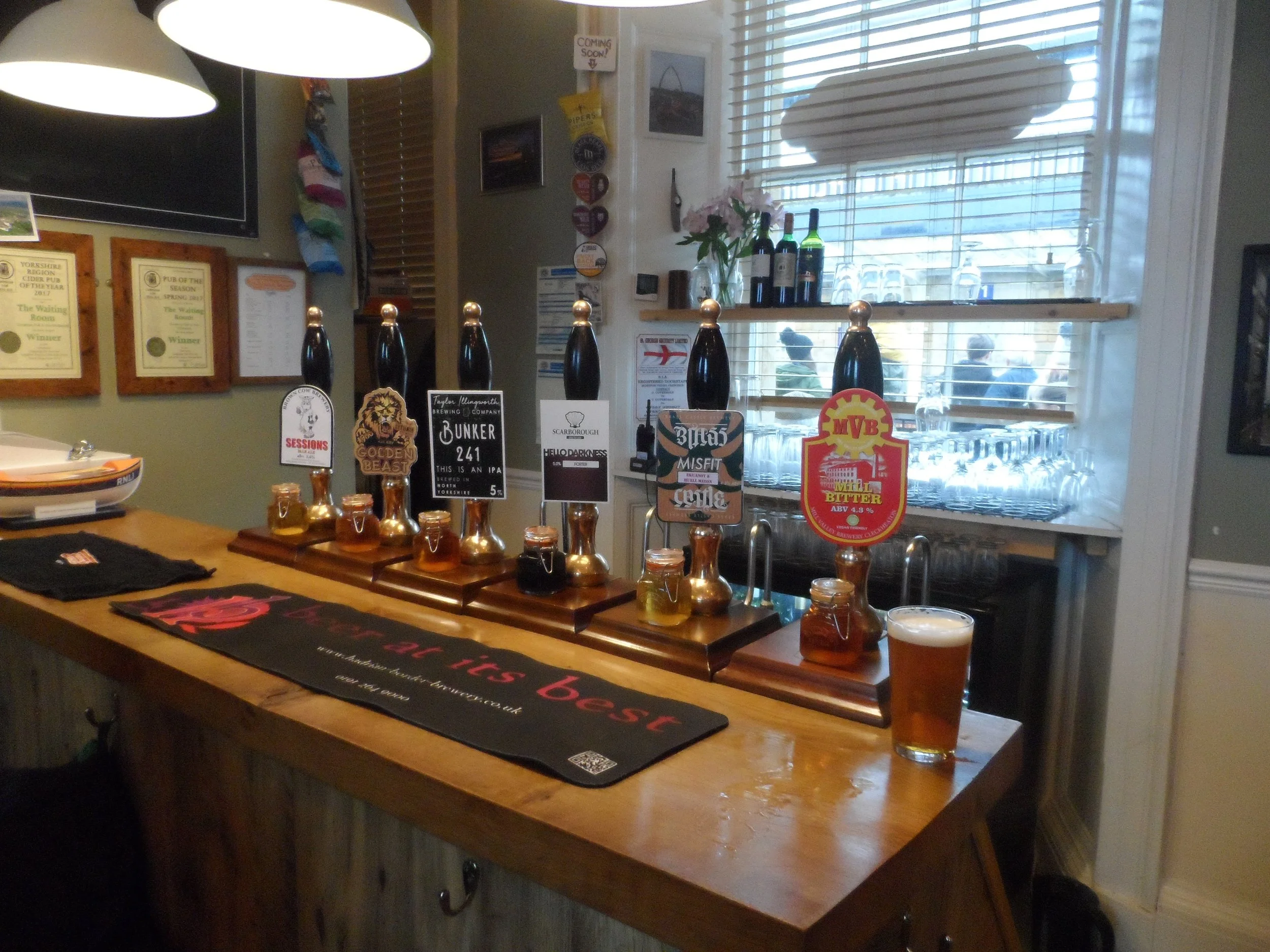 Real ale: Bunker 241 (Taylor); Hello Darkness Porter (Scarborough); Mill Bitter (Mill Valley); Golden Beast (Lytham); Misfit (Brass Castle); Sessions Pale Ale(Brown Cow Brewery)