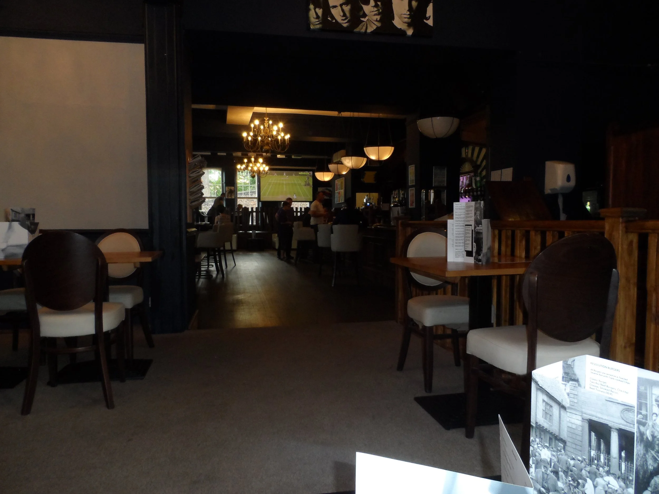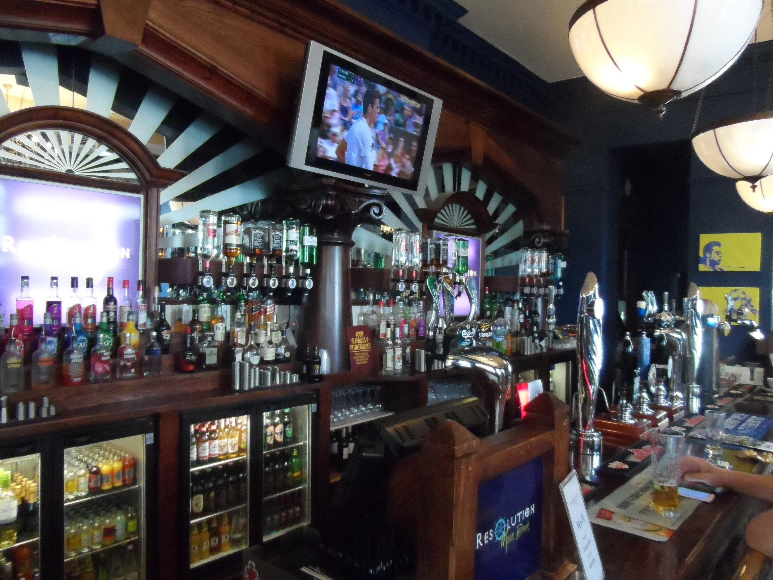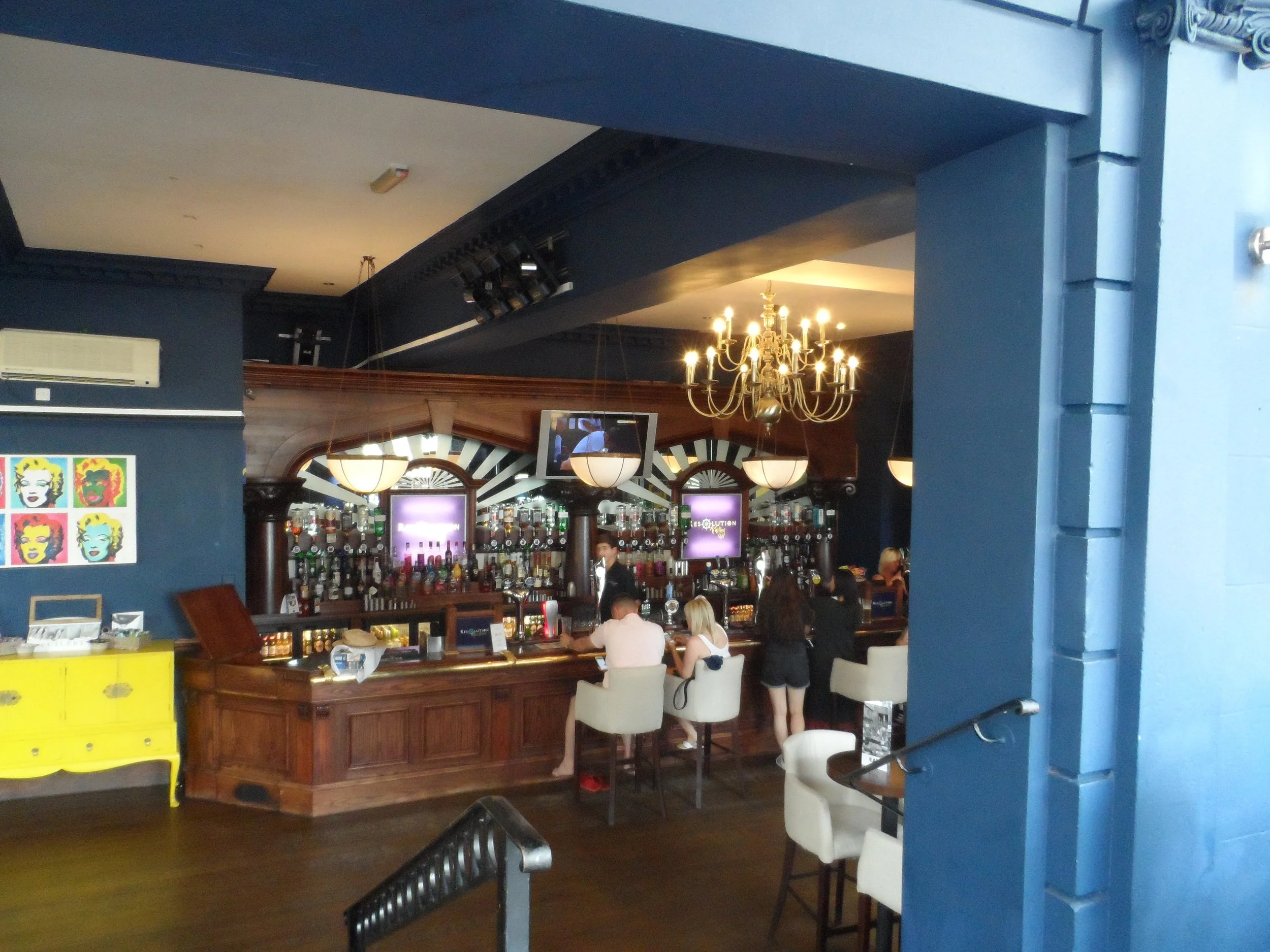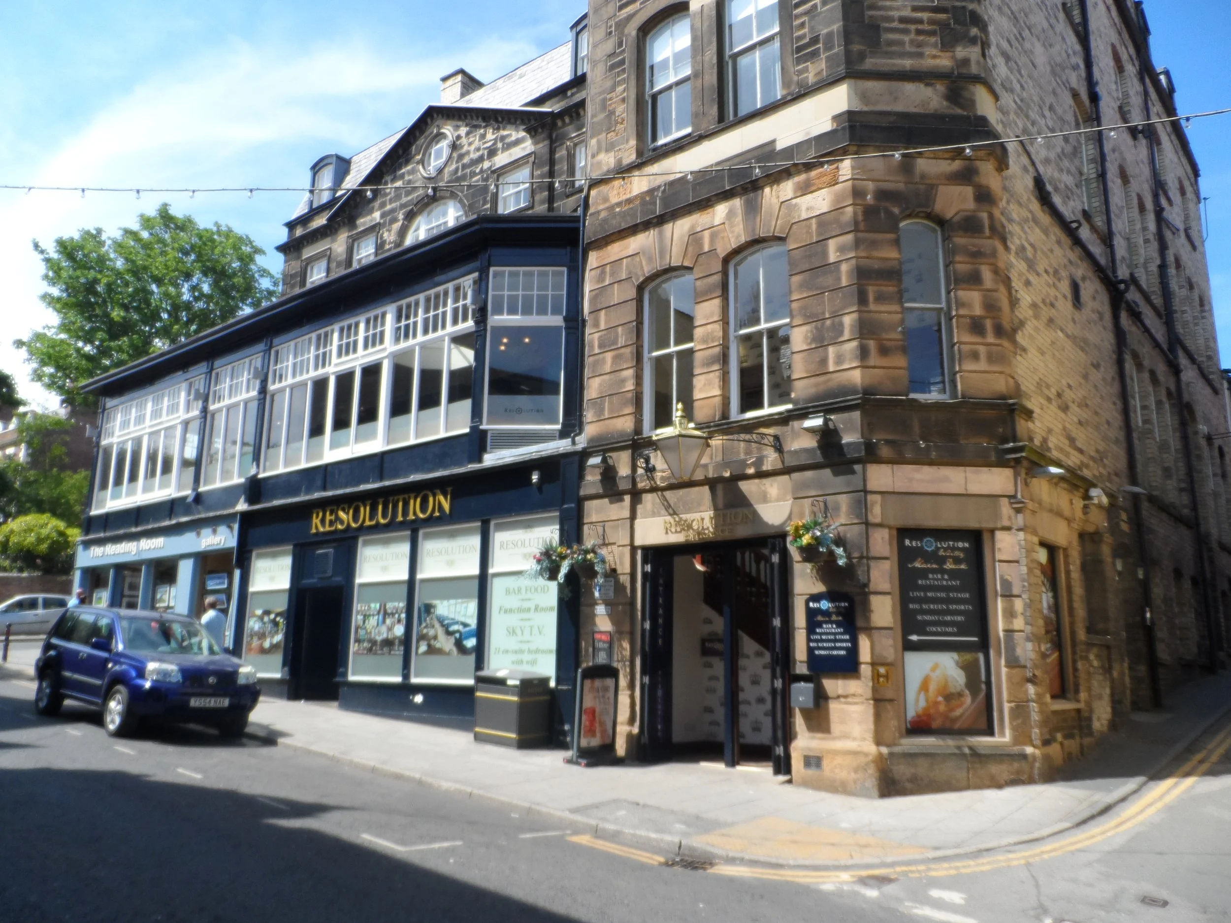 The Resolution Hotel is on a corner which and has an entrance from both streets (because of the hill these are on flat from one and upstairs from the other.) Either takes you to a large room with the servery along the back wall. This has armchair style stools. There are three distinct areas .In front of the bar is a large standing space with high tables Beyond this some steps take you to a seating area with lots of low semi-circular booths and dining tables. This has large windows letting in a lot of light, with a view. Further along from the bar is a third space with sofas and low tables. There are a couple of large TV screens but these do not over power the pub. Food offered and hotel has restaurant. No dogs.