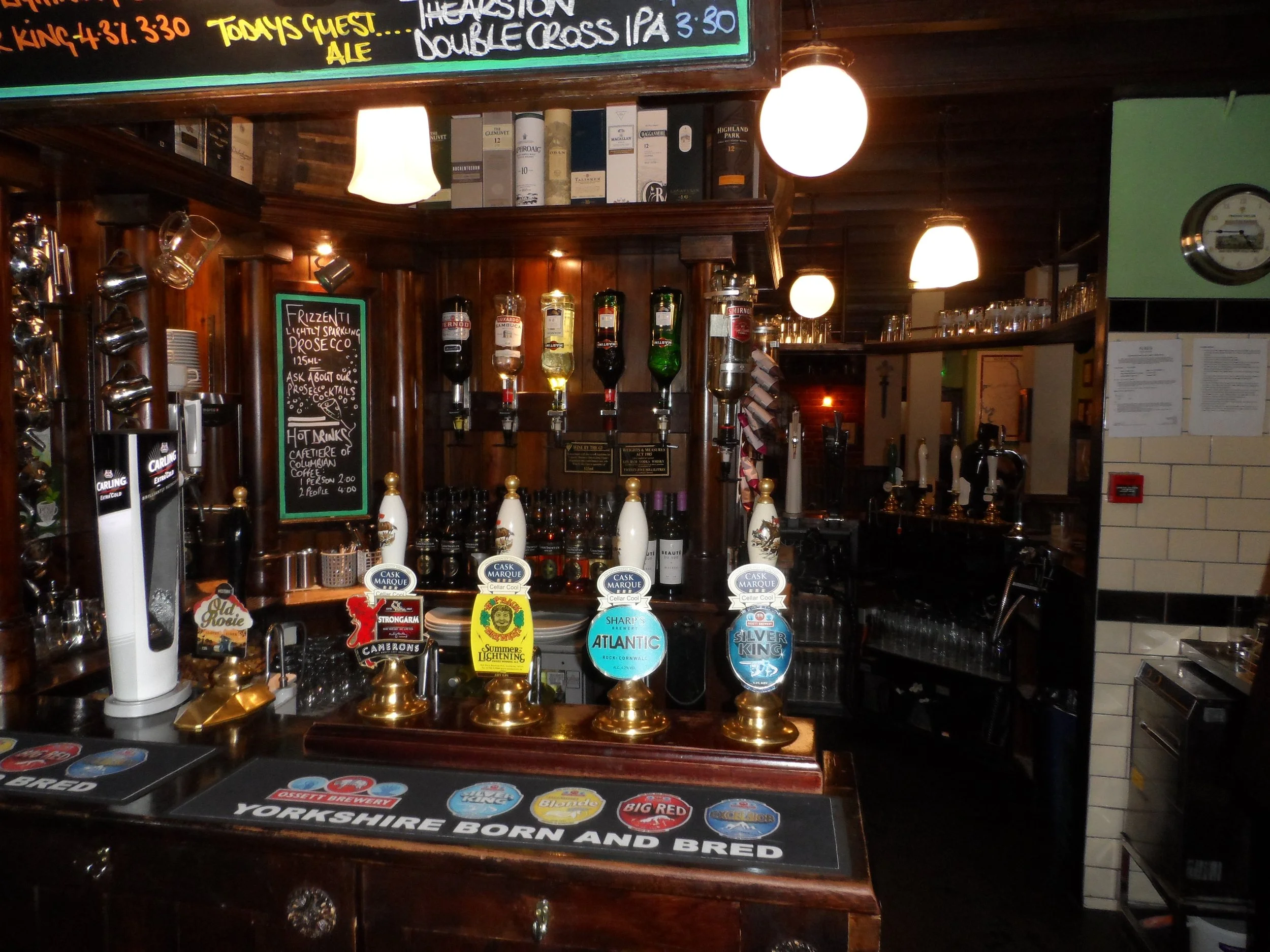 Real ale: Summer lightning (Hop Back); Atlantic (Sharps); Silver King (Ossett!!!); Platform 3 (only outlet for this ale from Whitby); Golden Best (Timothy Taylor); Yorkshire Blonde (Osett); Double Cross (Theakston)
